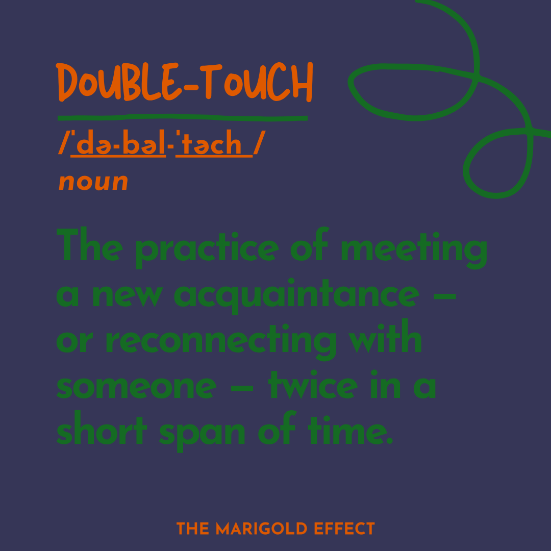 Double-touch is the simple practice of meeting a new acquaintance — or reconnecting with someone — twice in a short span of time. When the first interaction is still fresh, a quick follow-up creates a sense of continuity and ease. The second meeting often feels more vivid and grounded — it builds on momentum, opens the door to deeper relationship, and helps turn a passing conversation into a more lasting connection.